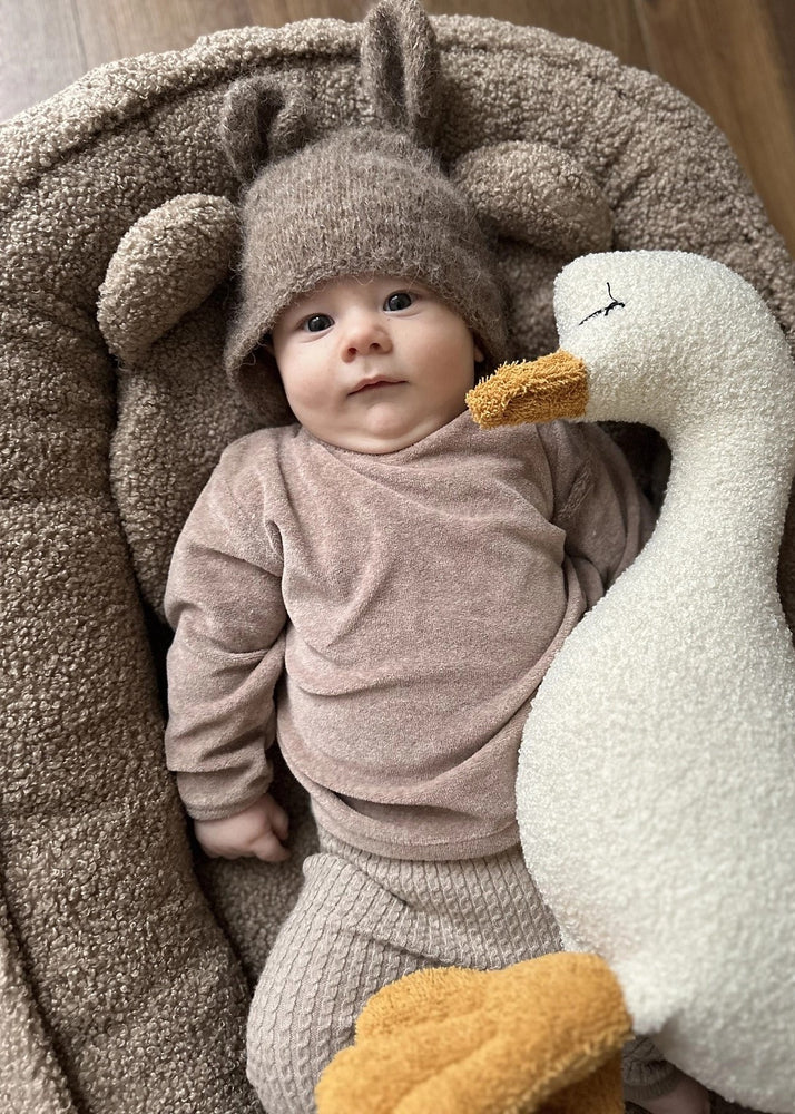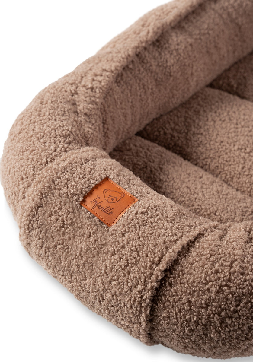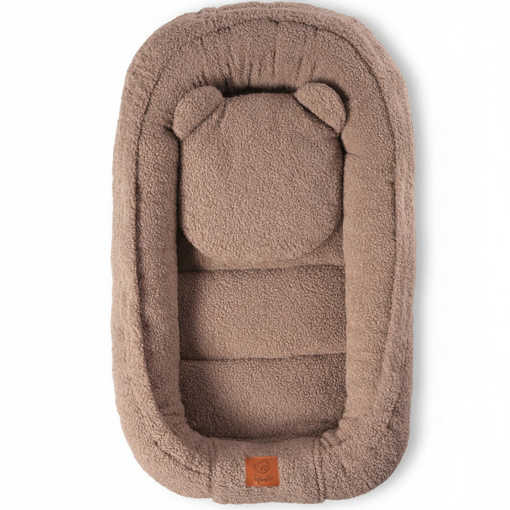 Šis kūdikių lizdelis su pliušine pagalvėle sukuria malonią, saugią ir komfortišką erdvę tavo mažyliui nuo pirmųjų gyvenimo dienų. Lizdelis pagamintas iš ypač švelnaus „baranek boucle“ tipo audinio, kuris primena pūkuotus avinėlio vilnonės tekstūros paviršių – malonus liesti, šiltas ir minkštas.