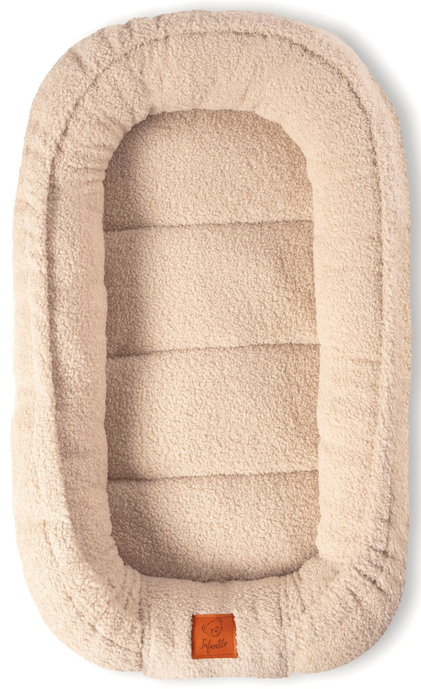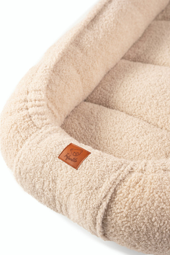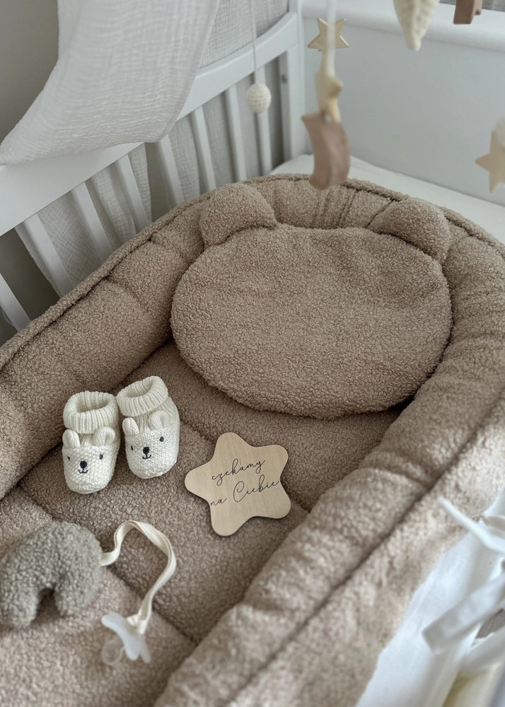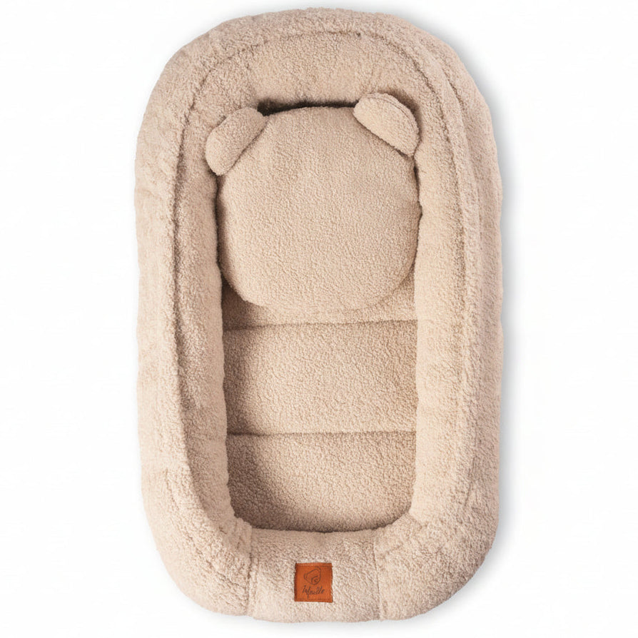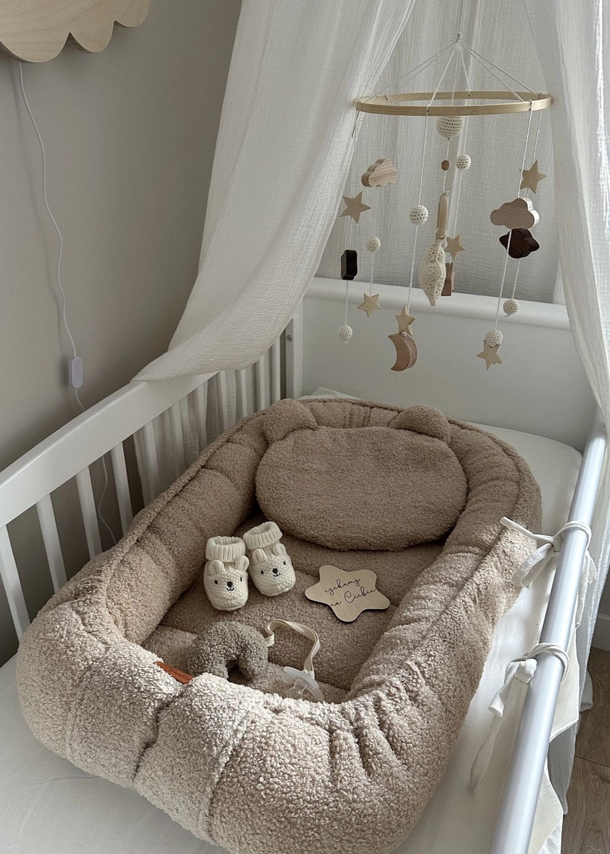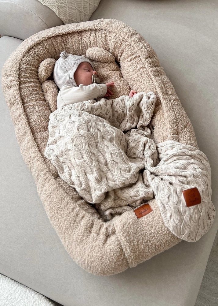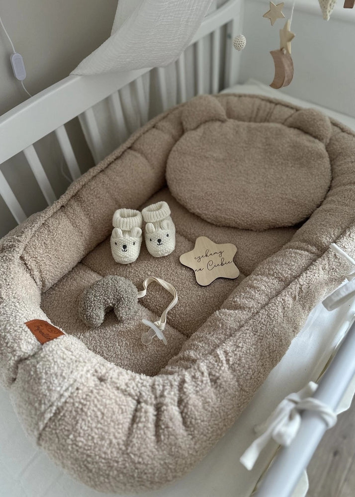Šis kūdikių lizdelis su pliušine pagalvėle sukuria malonią, saugią ir komfortišką erdvę tavo mažyliui nuo pirmųjų gyvenimo dienų. Lizdelis pagamintas iš ypač švelnaus „baranek boucle“ tipo audinio, kuris primena pūkuotus avinėlio vilnonės tekstūros paviršių – malonus liesti, šiltas ir minkštas.