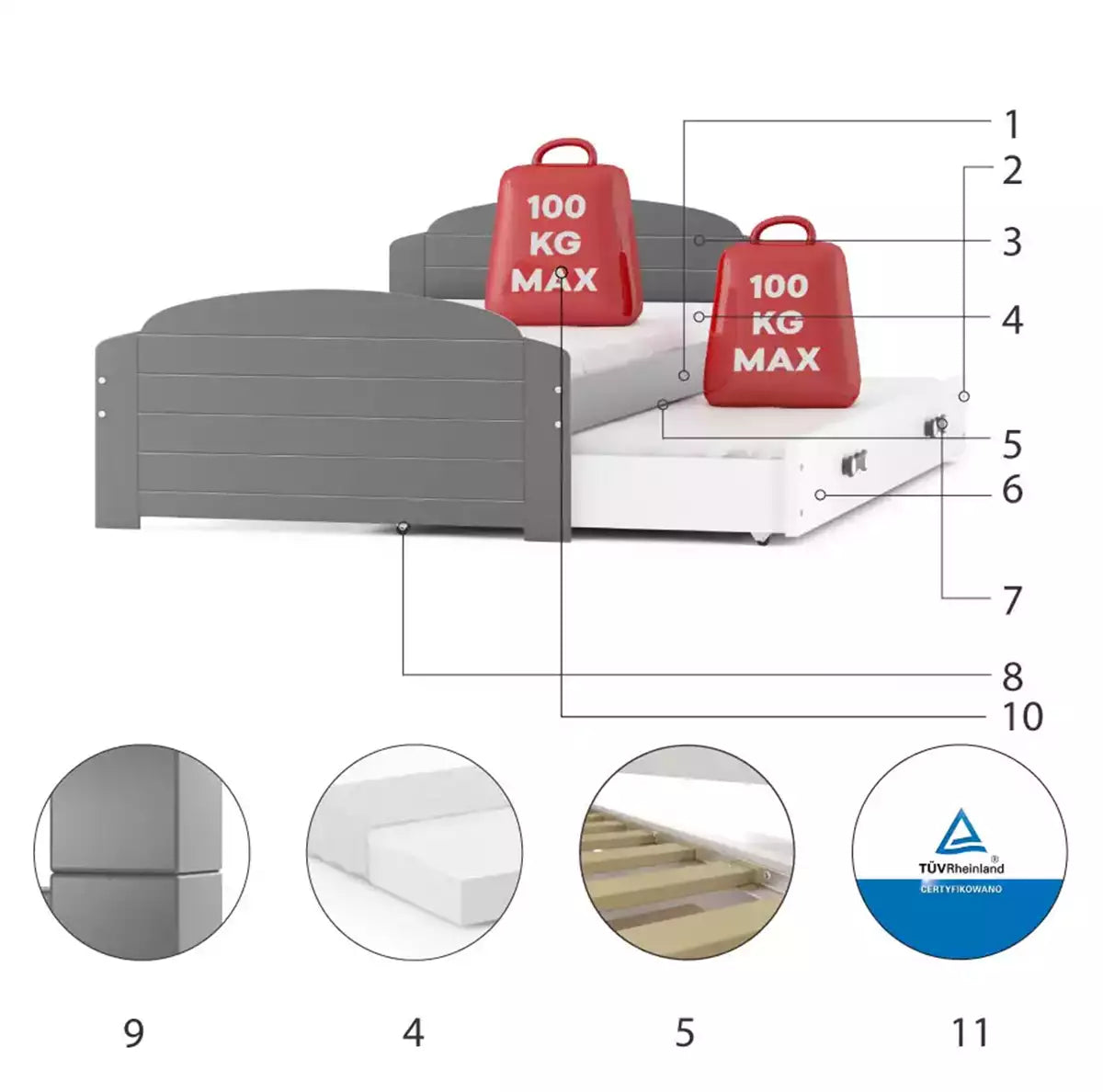 LiLi vaikiška lova 200x90 su čiužiniu ir papildoma lova, grafito/balta – pagrindinis vaizdas