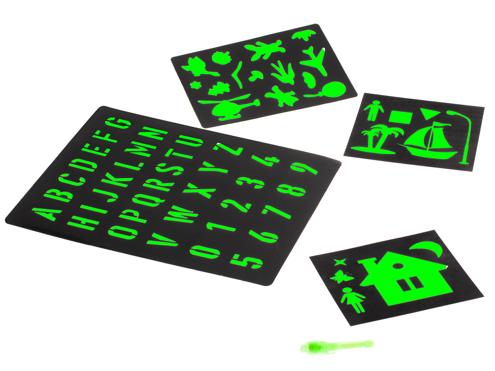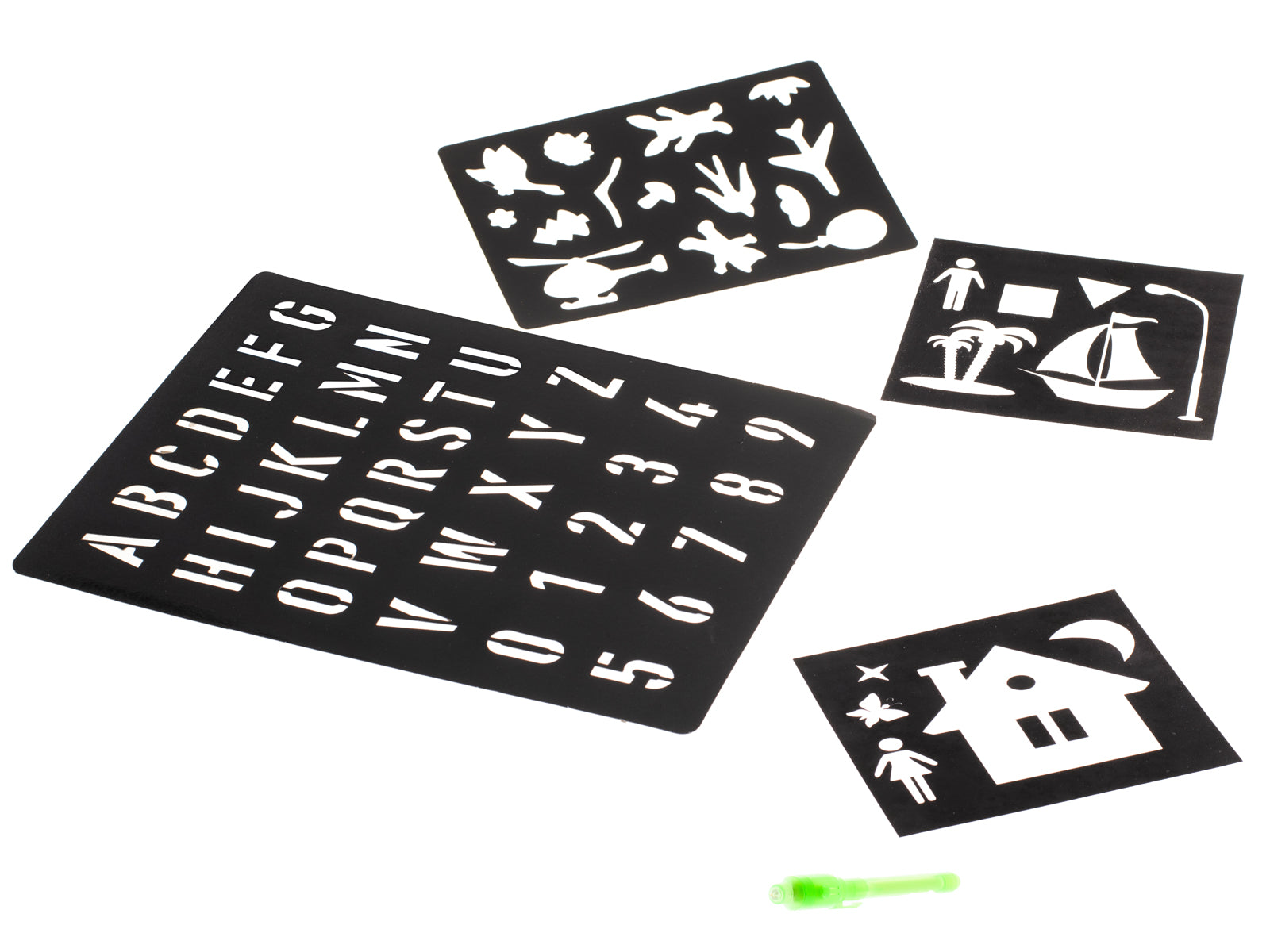 - Kūrybinis rinkinys: Komplektą sudaro švytinti kartoninė lenta, UV rašiklis ir trafaretai, padedantys kurti įvairius piešinius.