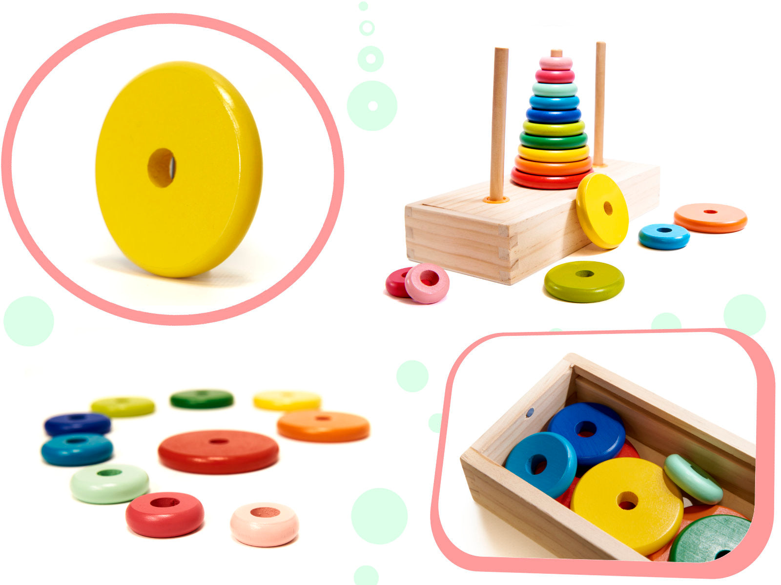 Duodami vaikui žaislą norite įsitikinti, kad jis yra saugus. Mes tai suprantame! Todėl kiekviena rinkinio detalė buvo kruopščiai nušlifuota, kad nė viena drožlė neprasiskverbtų pro mažą rankytę. Diskai nudažyti saugiais ir netoksiškais dažais. Gabalėliai yra per dideli, kad vaikas galėtų užspringti.