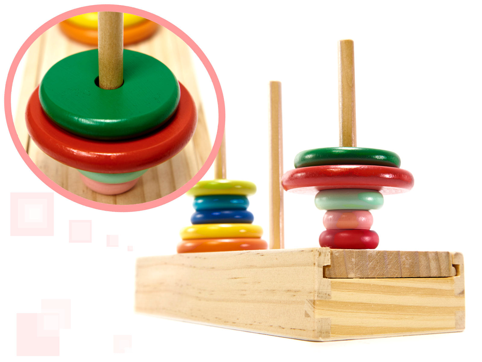 ŽAIDIMO TAISYKLĖS: visi iš eilės nuo didžiausio iki mažiausio išrikiuoti ritiniai turi eiti nuo pirmojo bokšto iki paskutiniojo, naudojant vidurinįjį bokštą. Paskutiniame bokšte lėkštės vėl turi būti išdėstytos nuo didžiausios iki mažiausios. Vienu metu galima perstatyti tik vieną ritulį, laikantis taisyklės, kad mažesnis ritulys visada dedamas ant didesnio.