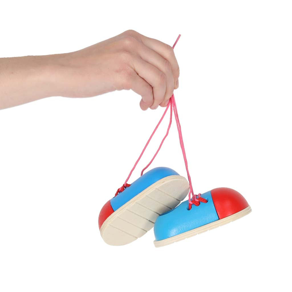 - Pilnas rinkinys: Į komplektą įeina du mediniai batukai, skirti šniūravimo pratimams.