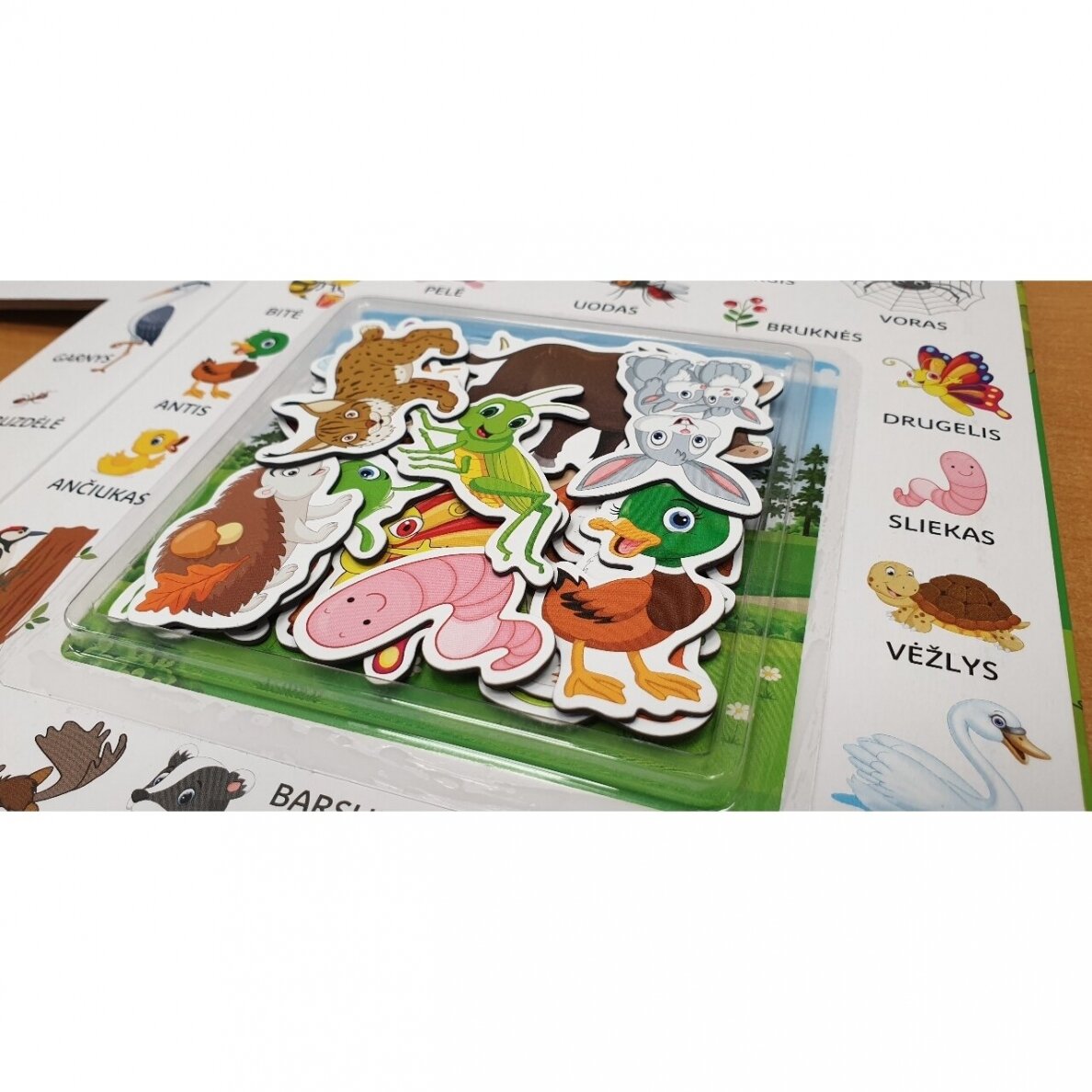 Gamta – gyvūnų namai. Miške, upėje ir pievoje yra daugybė gyventojų! Smagu juos pažinti ir su jais gražiai sugyventi. Ši knygelė ir padės mažyliams užmegzti su gyvūnais pirmąją pažintį. Dėliodami 20 magnetukų vaikai ne tik įsidėmės gyvūnų pavadinimus ir gyvenamąsias vietas, bet ir išmoks orientuotis erdvėje. Be to, tai proga daugiau pakalbėti su vaikais apie gamtą ir mūsų pareigą ją saugoti. Linkime smagios ir prasmingos veiklos!