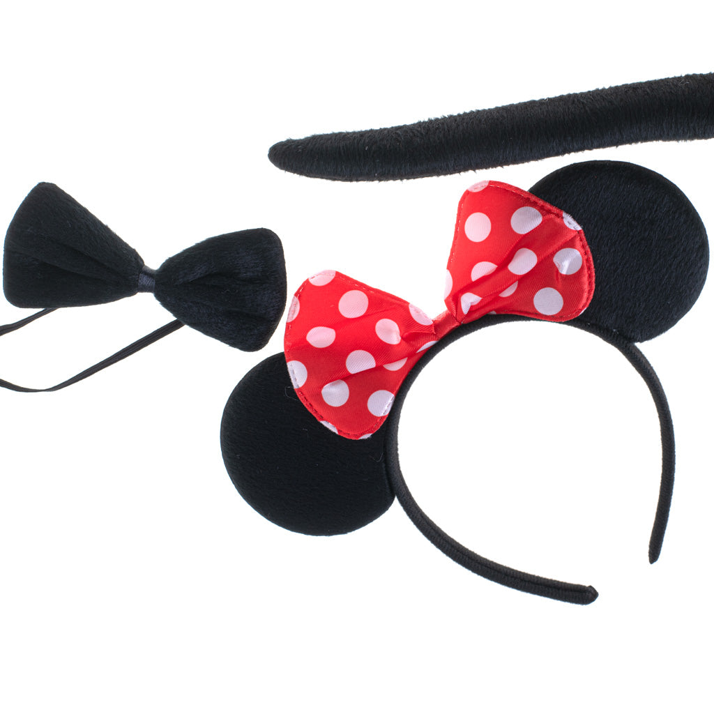 - Pilnas rinkinys: Į komplektą įeina galvos juosta su ausytėmis ir kaspinu, varlytė ir uodegėlė, sukuriantys visapusišką pelės įvaizdį.