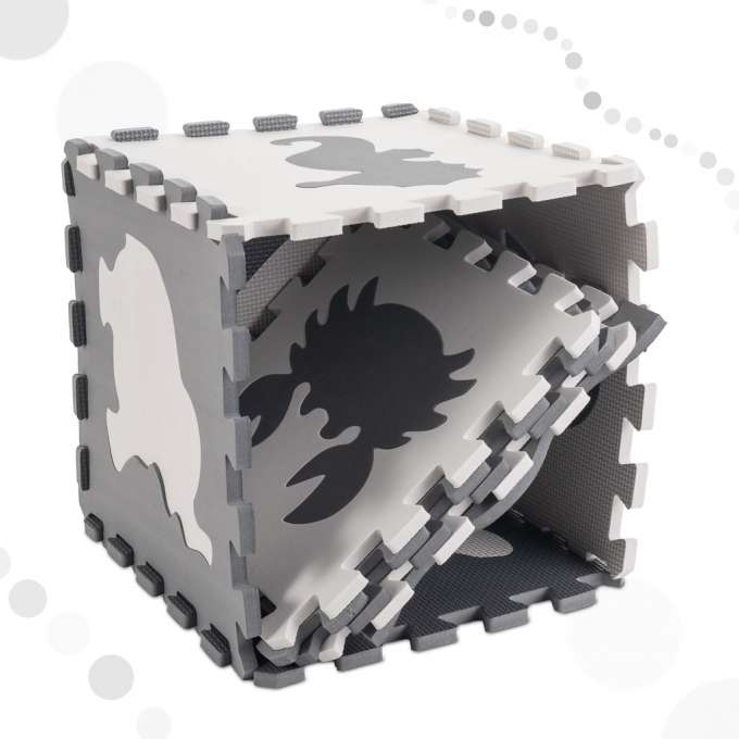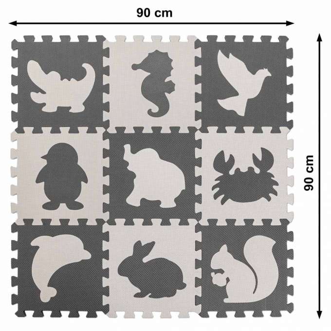 Putplasčio žaidimų kilimėlis yra 9 dalių dėlionės rinkinys, sukuriantis saugią vietą žaisti ir mokytis. Pilka ir smėlio spalvų schema su kontrastingais raštais skatina kūdikio regėjimą. Kiekvienoje dėlionėje pavaizduotas skirtingas gyvūnas , kurį galima išimti ir suderinti kaip klasikinio formos rūšiuotoje. Ištiesus kilimėlio matmenys yra 85 x 85 cm , jis pagamintas iš minkštų 1 cm EVA putų, kad būtų patogu ir izoliuoti nuo šaltų grindų.