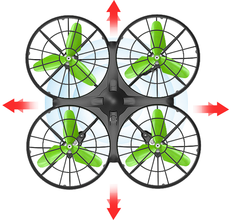 Dronas turi hover funkciją, todėl gali išlaikyti pastovų aukštį. Šią parinktį galima aktyvuoti atleidus kairę rankenėlę, kuri grįžta į centrinę padėtį, tuomet dronas išlaikys savo aukštį.