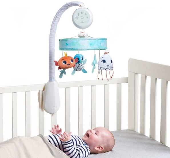Įdėkite kūdikį į lovelę po karuseline ir leiskite jam mėgautis ramia, atpalaiduojančia atmosfera dėl raminančių melodijų ir judesių. Pažiūrėkite, kaip jūsų kūdikis reaguoja į skirtingus garsus, kad sužinotumėte, kuris iš jų jam labiausiai tinka.