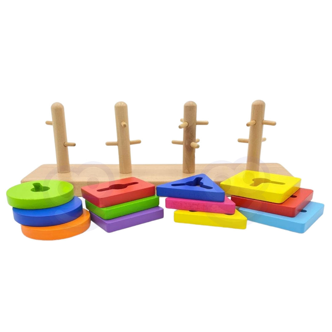 - Rankų įgūdžių lavinimas: Kaladėlių pritaikymas prie strypelių stiprina smulkiąją motoriką ir akies-rankos koordinaciją.