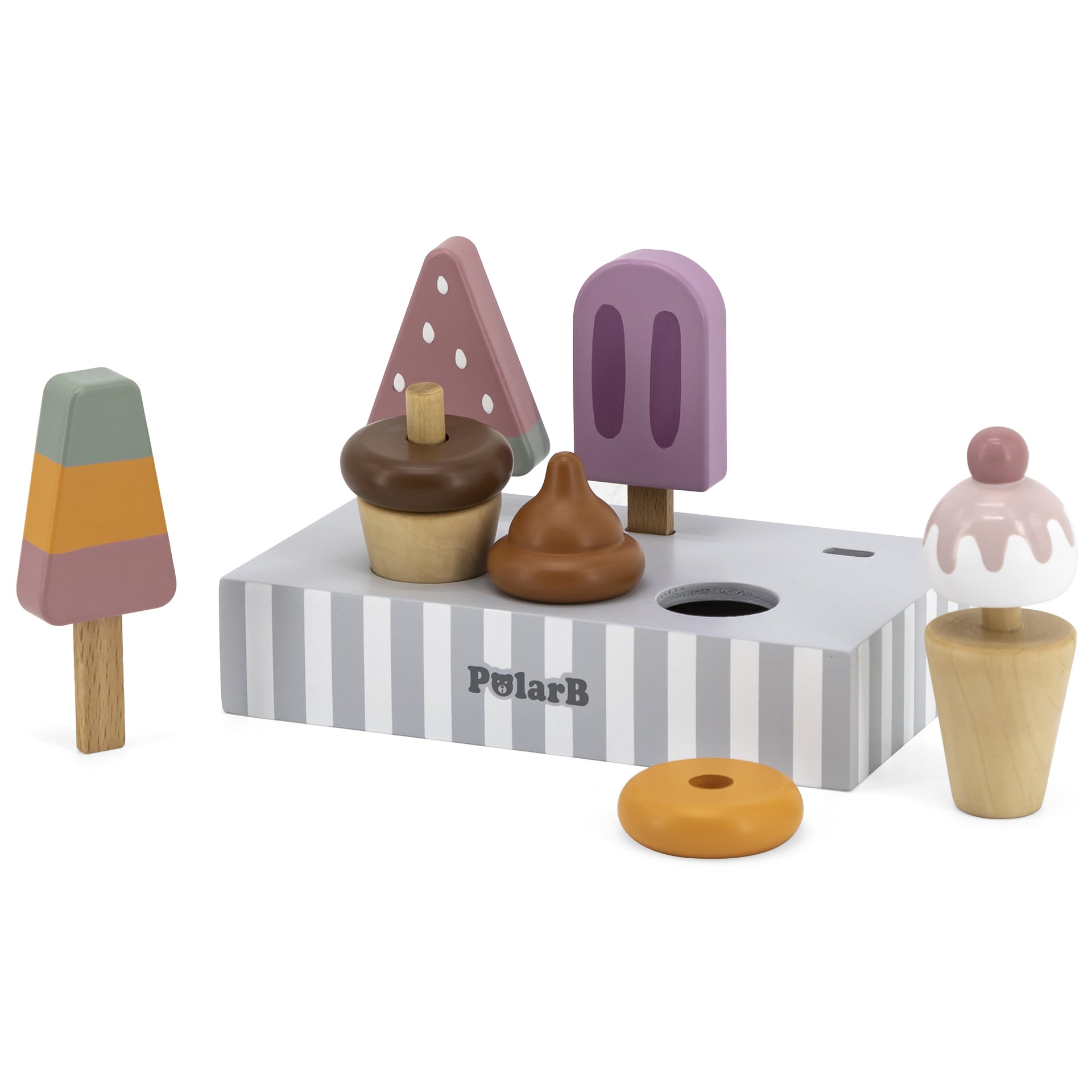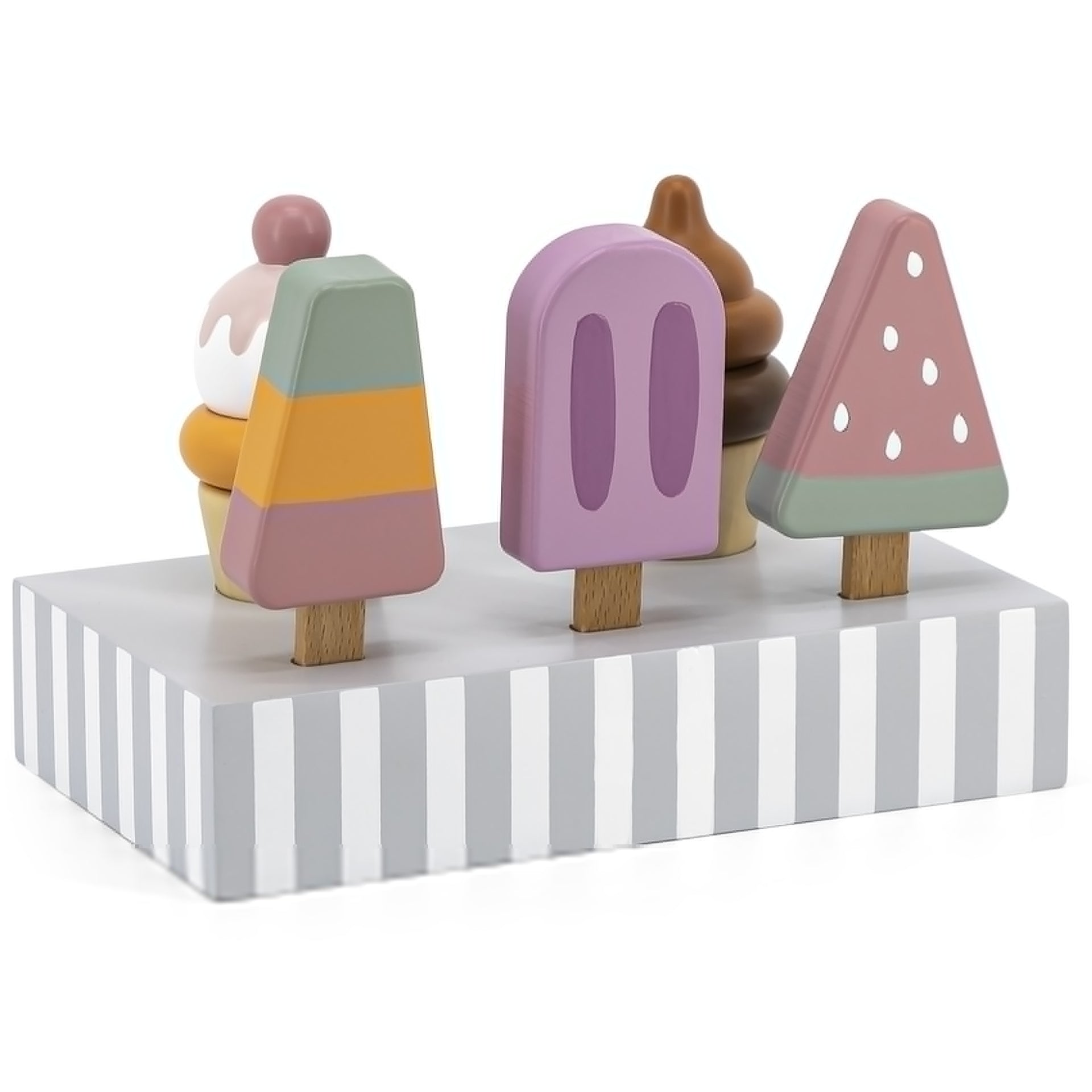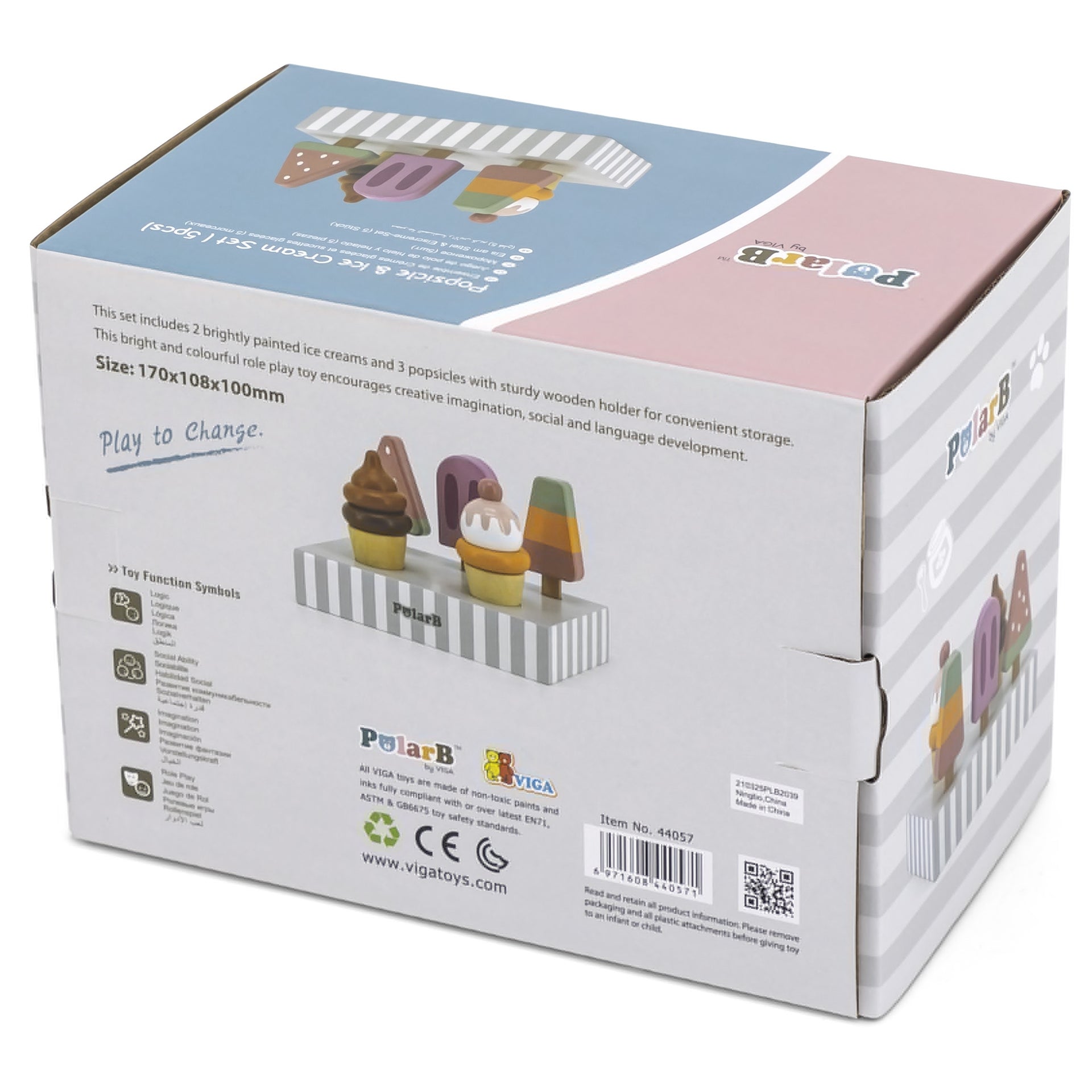 Šis žavingas VIGA PolarB medinis ledų ant pagaliuko rinkinys, kurį sudaro penki skirtingi skoniai ir patogus stovas, puikiai papildys bet kurią vaikišką virtuvėlę ar parduotuvės žaidimą. Pagaminti iš saugios medienos ir nudažyti netoksiškais dažais, šie skaniai atrodantys ledai skatins kūrybiškus vaidmeninius žaidimus.
