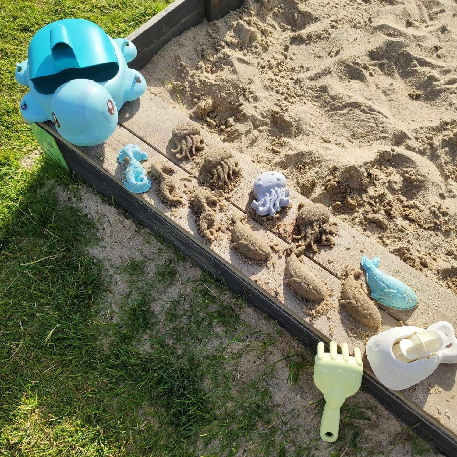 - Komplektacija: Rinkinį sudaro vėžliukas, laistytuvas, šaukštas, 3 skirtingos formelės, kastuvėlis, grėbliukas ir suktukas.