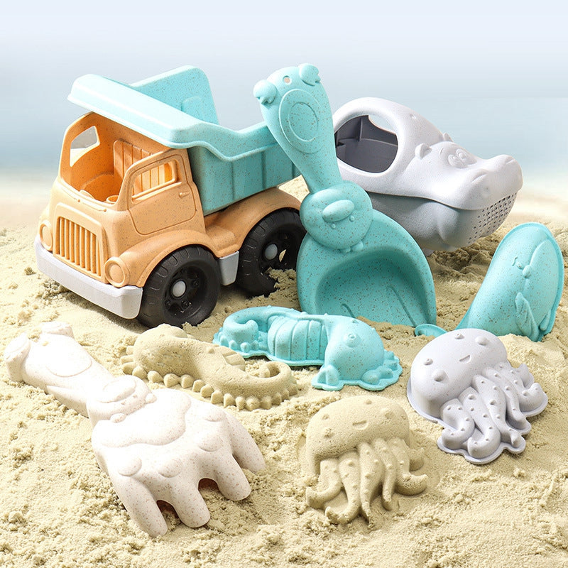 - Plati komplektacija: Rinkinį sudaro net 7 elementai: konvėkė su hipopotamo figūra, trys formelės, kastuvėlis, grėbliukas ir transporto mašinėlė.
