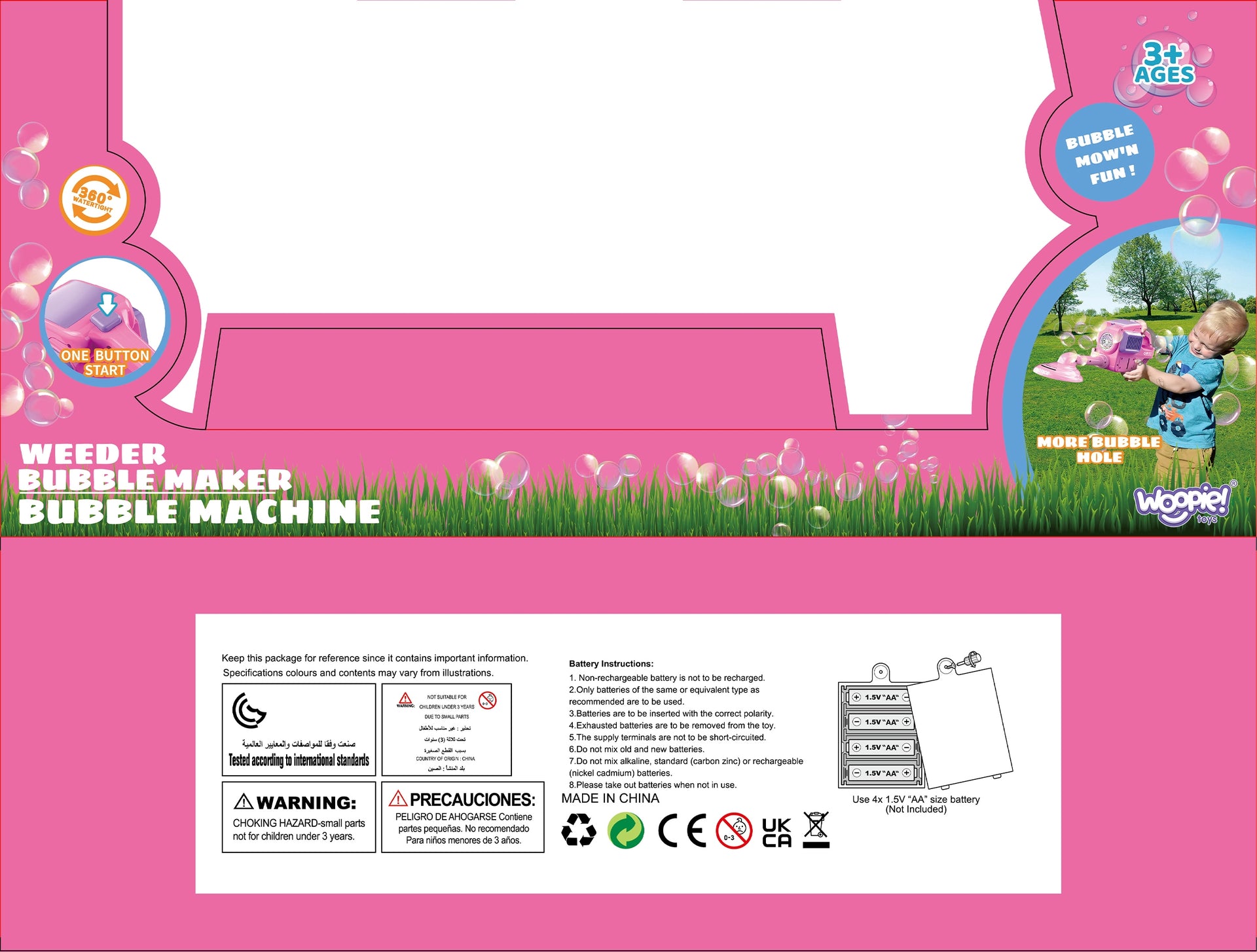 - Paruošta žaisti: Rinkinyje jau yra du muilo burbulų skysčiai, kad pramogos prasidėtų iš karto (baterijos nepridedamos).